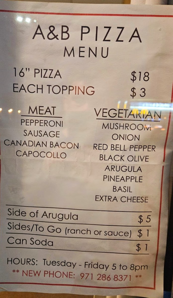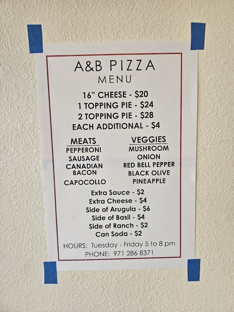 Introducing the menu at A&B Pizza - Seaside is an experience to cherish. Nestled at 280 S Roosevelt Drive, this hidden gem has quickly become a favorite among locals and visitors alike. The appointment-only hours from 5 to 8 PM hint at the meticulous charm of this one-man show.